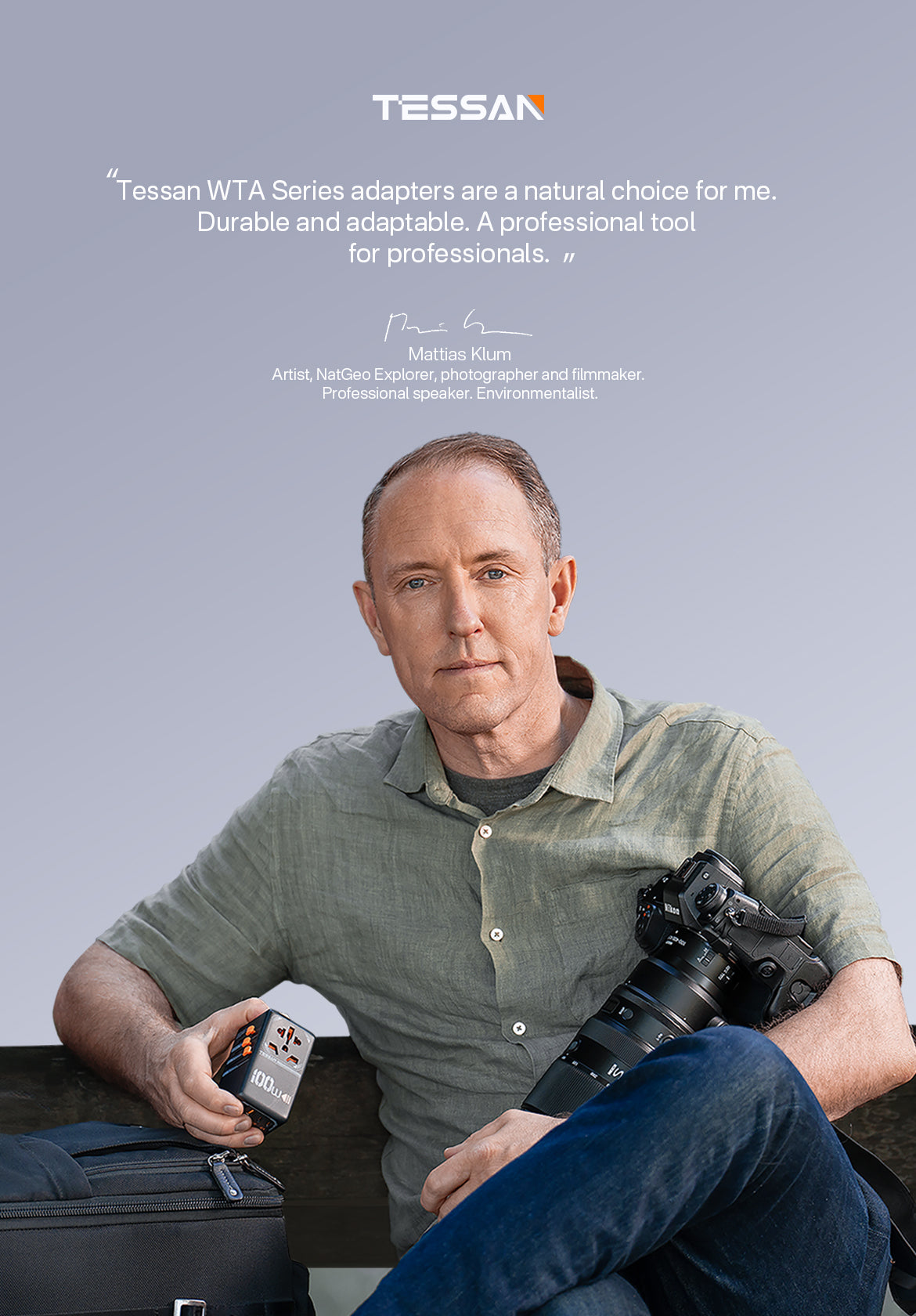 "As a photographer, filmmaker, and artist for organizations like National Geographic and The New York Times, I specialize in endangered species, ecosystems at risk, and ethnic minorities in peril. This job takes me to countries all over the world, and situations are often logistically difficult and challenging. I need to be able to trust my gear; from cameras, tripods, and waterproof cases to storage media and accessories. TESSAN WTA Series adapters are a natural choice for me. Durable and adaptable. A professional tool for professionals." - Mattias Klum